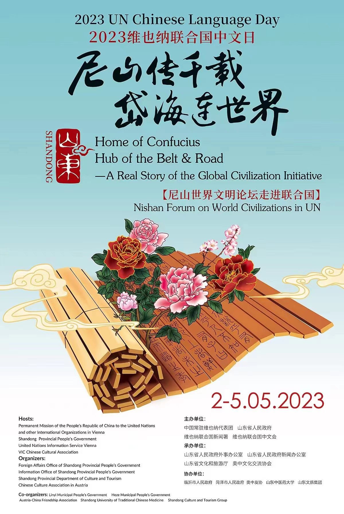今年,由中国常驻维也纳联合国代表团与山东省人民政府联合主办的2023维也纳联合国中文日活动将于5月2日在维也纳联合国总部开幕。这次活动将目光聚焦于中华文明的发源地的山东,以“尼山传千载 岱海连世界——全球文明倡议的生动故事”为主题,将向世界展示山东作为孔子故里和“一带一路”重要枢纽的深厚文化、锦绣山河和悠久历史,生动讲述中华文明与全球文明交流互鉴的真实故事。
