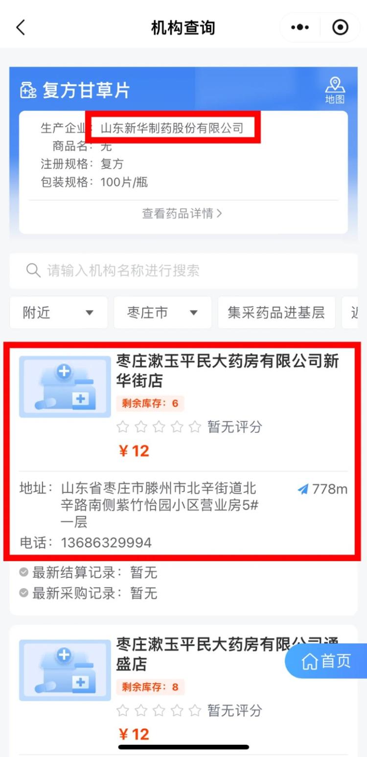 第二步:输入你想查询的药品名称,选择你想要查询对应生产厂家的药品,点击进去,就能查看这款药品在你附近药店的售价。还可以根据距离进行排序,还能筛选区域。