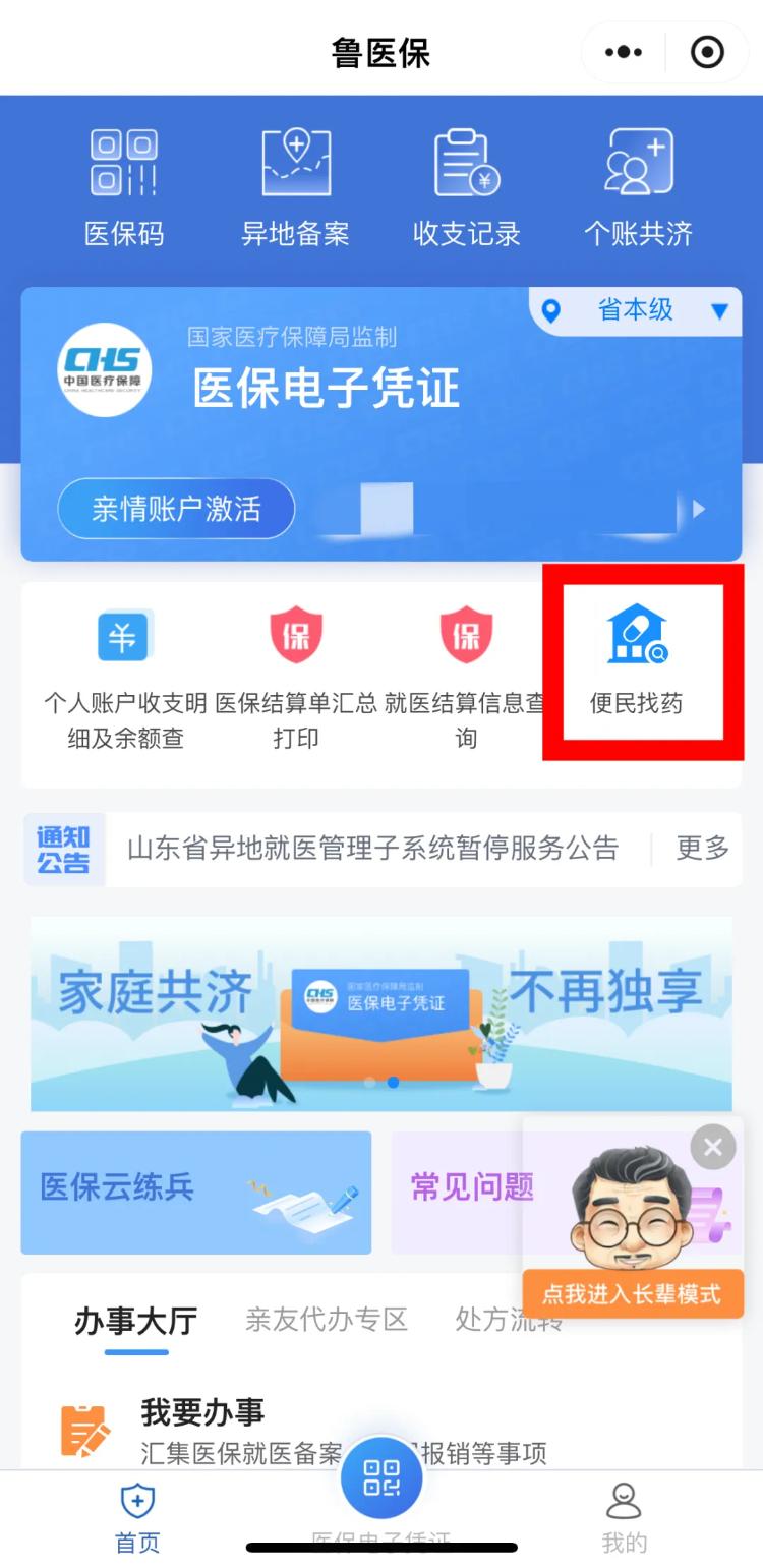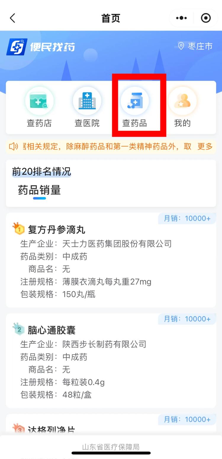 第一步:微信或者支付宝进入“鲁医保”小程序,点击“便民找药”,选择“查药品”。