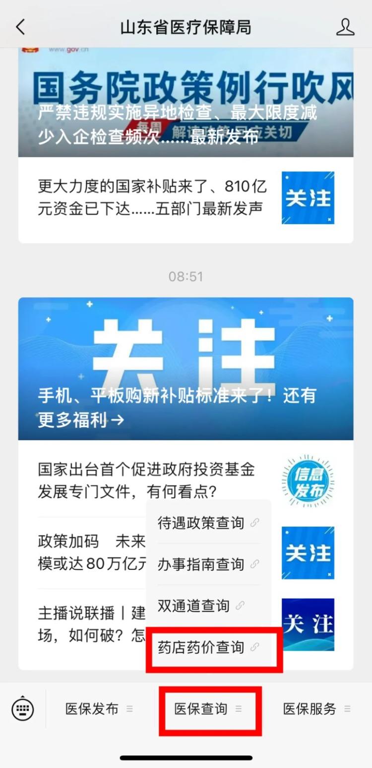 第一步:进入“山东省医疗保障局”微信公众号,点击“医保查询”,选择“药店价格查询”。