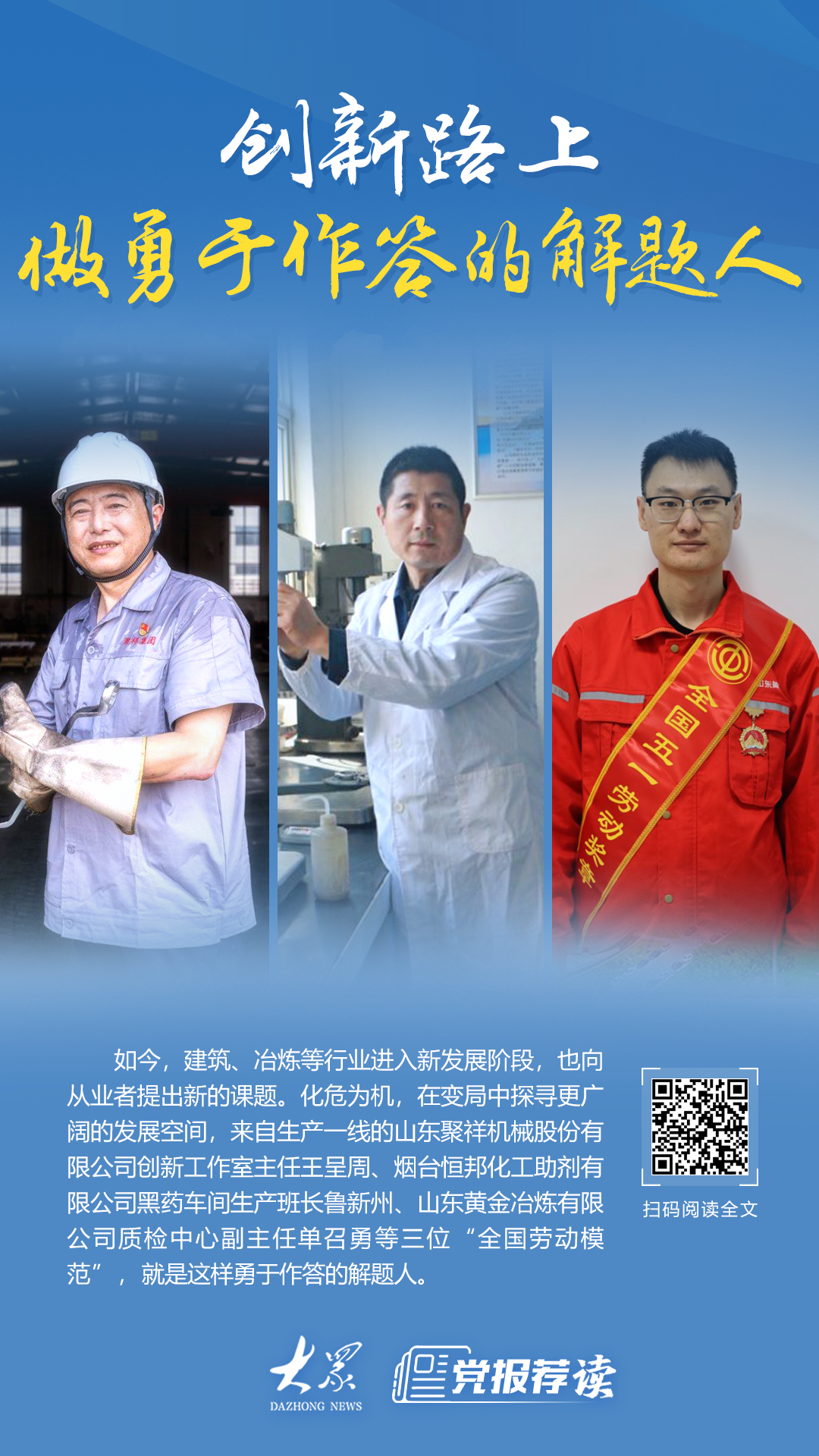 如今,建筑、冶炼等行业进入新发展阶段,也向从业者提出新的课题。化危为机,求新求变,来自生产一线的山东聚祥机械股份有限公司创新工作室主任王呈周、烟台恒邦化工助剂有限公司黑药车间生产班长鲁新州、山东黄金冶炼有限公司质检中心副主任单召勇等三位“全国劳动模范”,就是这样勇于作答的解题人。