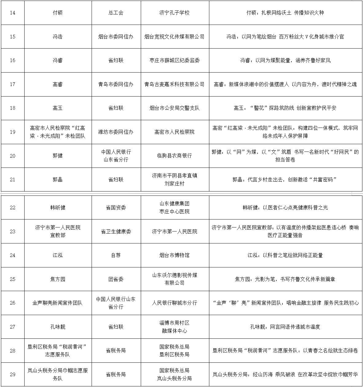 大众网记者 王卫 滨州报道 6月23日,第五届山东网络文明周启动仪式上,揭晓了2025年“好网民·在山东”主题活动优秀故事获奖名单。 经过严格的筛选与评审,包括“从‘迷彩绿’到‘税务蓝’:一名转业税干的公益人生”“柏秀静:以匠心守护万里铁道线”“滨州市公安局宣传处:宣传‘笔杆子’铸魂塑形 书写‘挺膺担当’时代答卷”等在内的100篇优秀故事脱颖而出,成为本次活动的亮点。“网络同心,文明同行”,正是这些好网民优秀代表的生动实践,让正能量充盈网络空间。 获奖作品名单如下:
