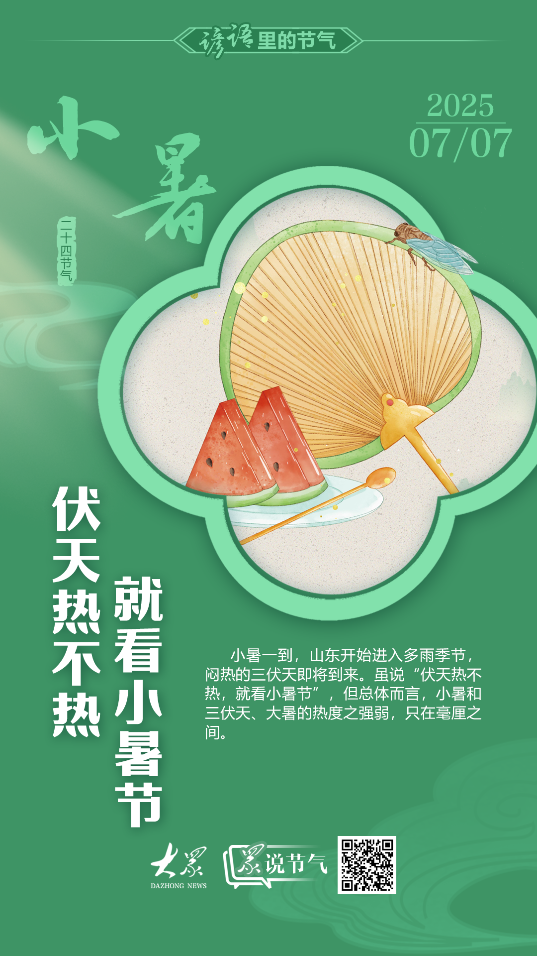 小暑一到,阳光炽烈,但古人认为天气刚开始炎热,还没达到极热的程度,因此称“小暑”。山东开始进入多雨季节,闷热的三伏天即将到来。俗谚云:“伏天热不热,就看小暑节。”总体而言,小暑和三伏天、大暑的热度之差,只在毫厘间。