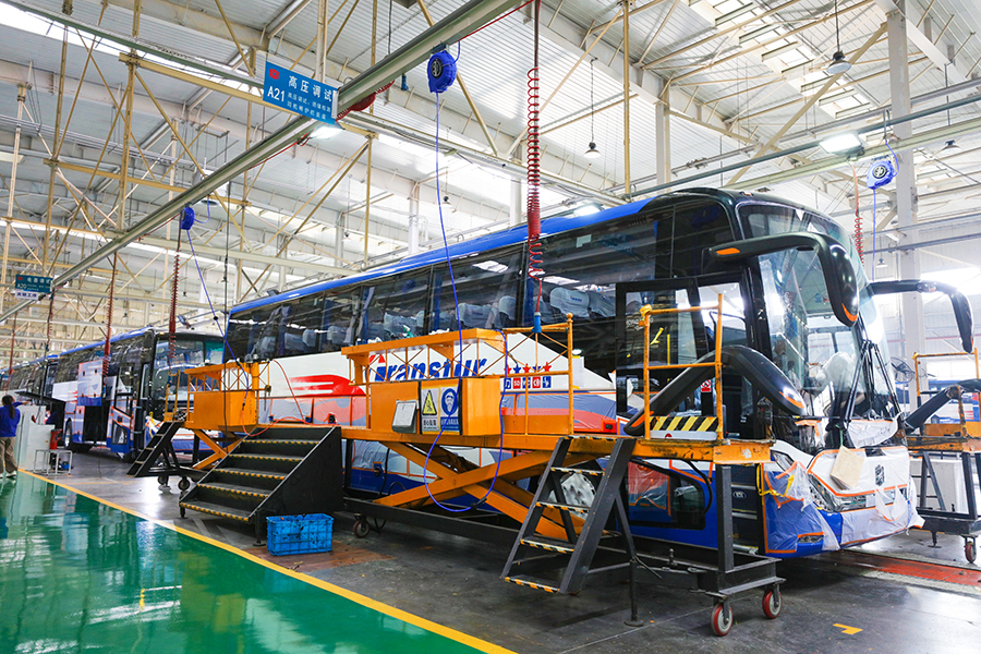 中通客车新能源客车生产车间,工作人员正在调试新能源客车