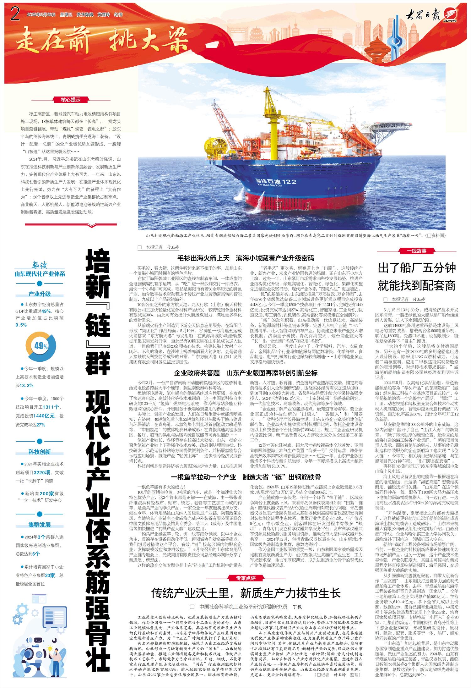 枣庄高新区,新能源汽车动力电池精密结构件项目施工现场,18栋单体建筑每天都在“长高”,一批龙头项目延链铺展,带动“煤城”蝶变“锂电之都”;胶东半岛的绵长海岸线上,青烟威携手竞逐海工装备,“设计—配套—总装”的全产业链优势加速形成,一艘艘“山东造”从这里扬帆远航……