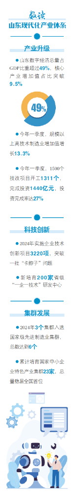 2024年5月,习近平总书记在山东考察时强调,山东在推进科技创新与产业创新深度融合、发展新质生产力、完善现代化产业体系上大有可为。一年来,山东以科技创新引领新质生产力发展,在推进产业体系现代化上先行先试,努力在“大有可为”的征程上“大有作为”:26个省级以上先进制造业产业集群抢占制高点,商业航天、人形机器人、新能源电池等战略性新兴产业制胜新赛道,高质量发展迸发强劲动能。