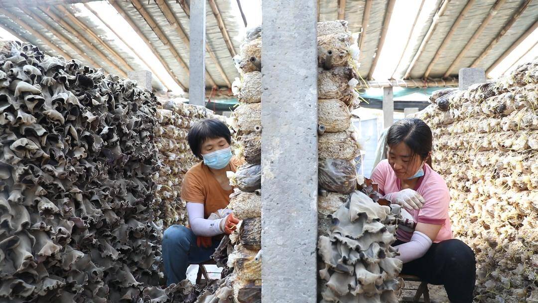 毛木耳种植是一项“技术活”,每个精心培育的菌袋,都要经过刺孔、浇水、通风等一系列工序。棚内的温湿度、光照强度和通风条件更要实时监测、动态调控,才能收获现在喜人的成果。