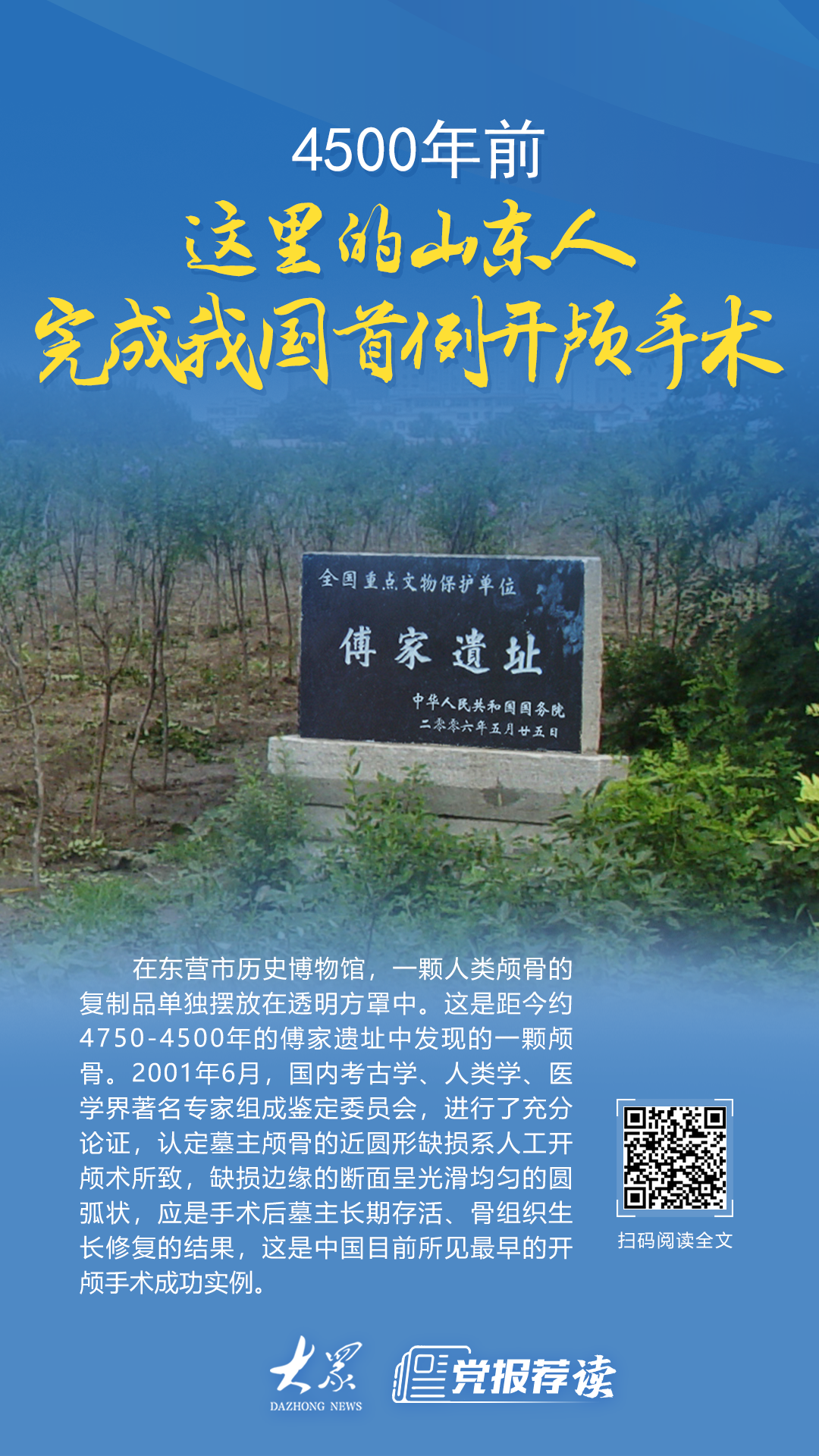 在东营市历史博物馆,一颗人类颅骨的复制品单独摆放在透明方罩中。“这是遗址中发现的一颗颅骨,它将中国开颅手术成功实例提早了1000多年。”赵金说。