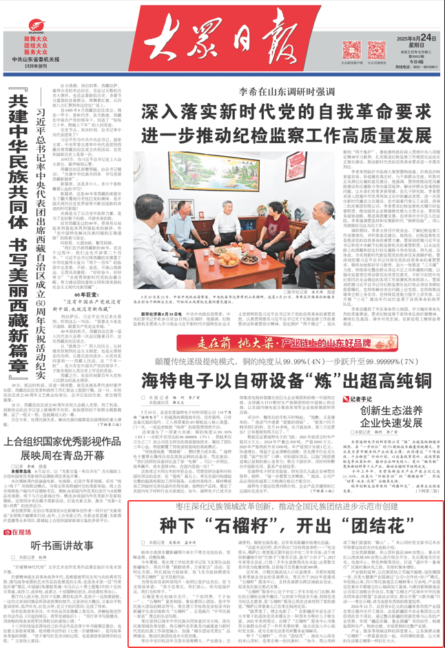 枣庄坚持以铸牢中华民族共同体意识为主线,深化民族领域改革创新,将石榴外在形象及内涵寓意与新时代党的民族工作深度融合,加强“榴乡团结花更红”品牌建设,推动民族团结进步示范创建。