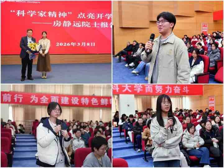 互动交流环节,现场气氛热烈而浓厚,青年学子们怀着对院士的崇敬与对医学事业的热爱,踊跃举手提问、积极交流。最后,房院士向全校师生送上了诚挚的祝福,对母校和青年学子深情寄语。