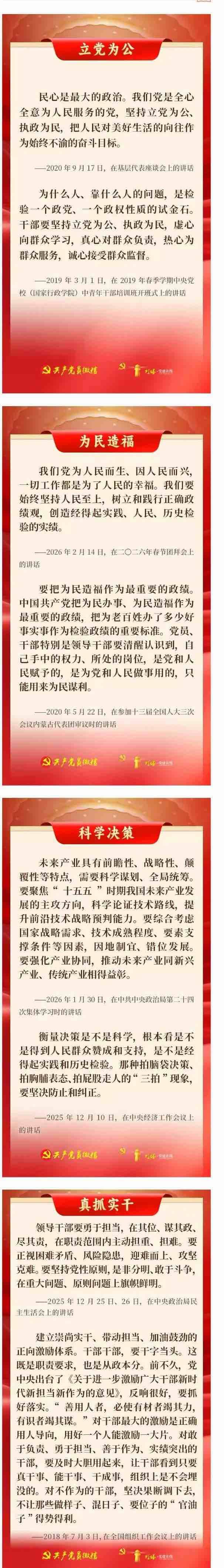 中共中央办公厅印发《关于在全党开展树立和践行正确政绩观学习教育的通知》,明确把“立党为公、为民造福、科学决策、真抓实干”这16个字,作为学习教育的总要求。“十五五”开局之年,一起学习总书记相关重要论述,将16字总要求内化于心、外化于行,树立和践行正确政绩观,投身强国建设、民族复兴的关键一程。
